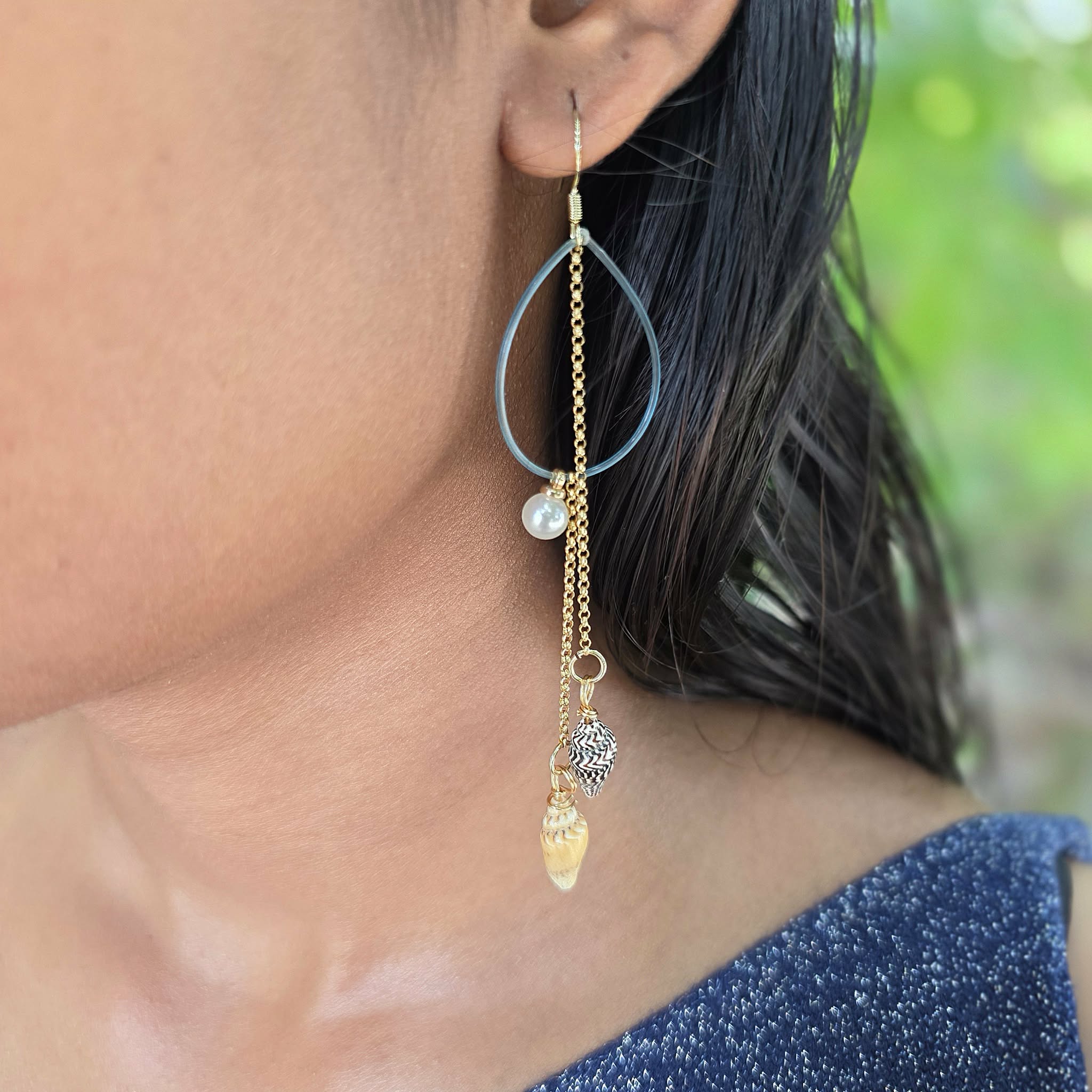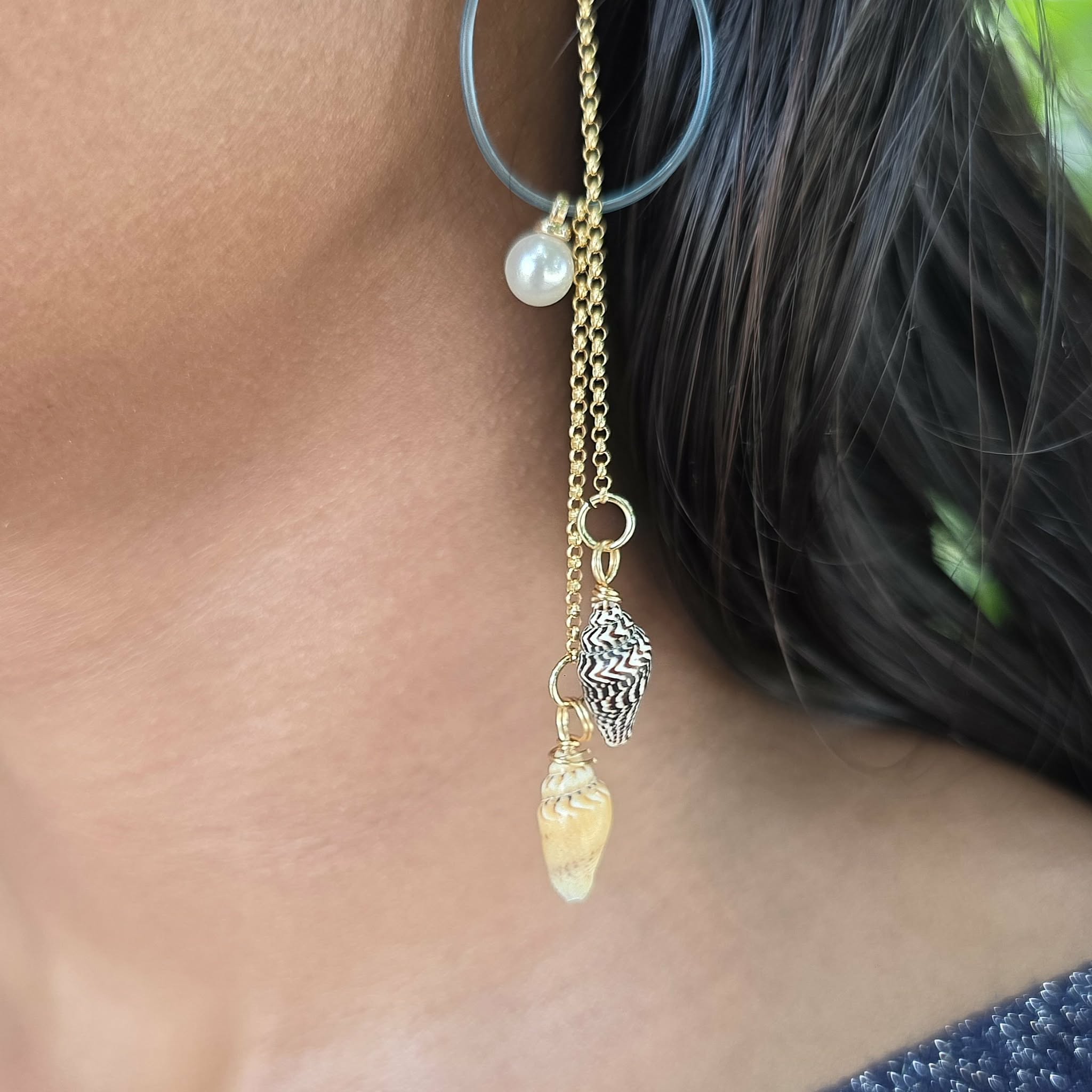 MATERIAL - 18k gold vermeil earring hooks, fishing line, freshwater pearls, shells, 14k gold fill chain detail